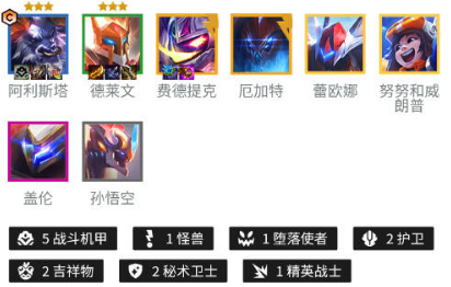 核心配置由阿利斯塔领衔,搭配德莱文、费德提克等八位英雄组成,激活5战斗机甲为核心的复合羁绊网络。德莱文与厄加特形成双重物理输出核心,蕾欧娜与努努构建防御体系,盖伦与孙悟空提供战场控制,形成攻守兼备的立体作战架构。