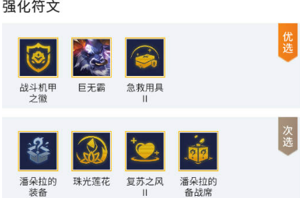 强化符文选择需注重体系契合度,机甲徽章可激活高阶羁绊,急救用具提升团队续航,潘多拉系列保证装备适配性。次选复苏之风与珠光莲花分别强化生存与法系输出,需根据战局灵活调整策略。