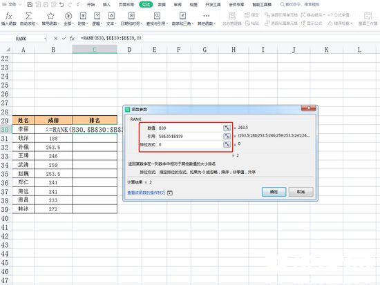 2、在参数设置界面,需准确填写三个关键参数:首先在「数值」栏输入待排序的具体单元格坐标(例如B30单元格);其次在「引用」栏框选整个数据区域(如B30:B39范围),此时需要特别注意使用Shift+F4组合键锁定绝对引用;最后在「排位方式」栏按需输入0(升序排列)或非零值(降序排列),确认无误后点击确定按钮即可生成排名结果。
